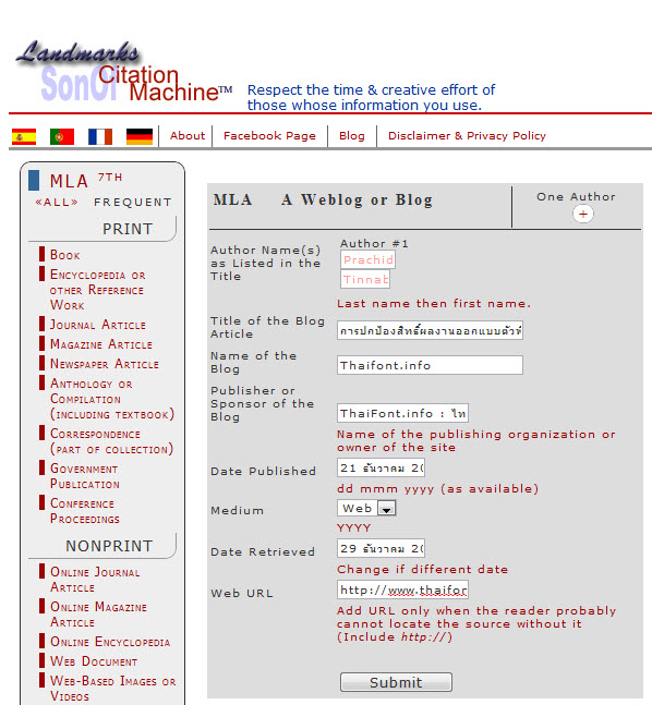 กรอกข้อมูลให้ครบตรงตามรายการ ก็ส่งให้ระบบของไซต์เขาสร้างให้ เสร็จแล้วก็ก็อปปี้เอาไปวางในเวิร์ดก็แค่นั้นเอง แต่ของภาษาไทยเราต้องมีเทคนิคปรับแต่งเองบ้าง ดูจากรูปที่ผมแนบมาแล้วกัน ลองอ่านและลองใช้ดูอย่างผู้รู้ แล้วจะรู้ว่าจะพลิกแพลงอย่างไร จะได้ประหยัดเวลาตรวจสอบความผิดพลาดในจุดเล็กจุดน้อยนี้ลงไปได้เยอะนะครับ ท่านอาจารย์ที่สอนวิชาระบบสารสนเทศ ท่านบรรณารักษ์ห้องสมุด หรือท่านผู้อ่านผลงาน(Peer Reader) ก็ควรรู้เท่าทันและรู้กันเรื่องในนี้ด้วยให้มากๆนะครับ หรือรู้แล้ว แต่อย่างไรก็ตาม ต้องตรวจสอบด้วยตาหรือให้ผู้รู้ดูอีกที และต้องแม่นในหลักการที่ถูกต้องด้วยเช่นกัน ไม่ใช่ว่าอะไรๆก็ออโต้กันไปหมด โดยไม่ยอมจดไม่ยอมจำกันเลย…